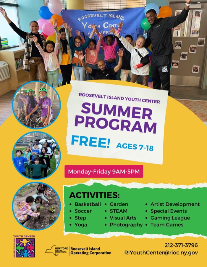 The Roosevelt Island Youth Center Summer Program is a free summer program offered to Roosevelt Island residents ages 7–18. The program runs during the summer months of July through August and provides a safe, supervised environment where youth can participate in a variety of recreational, educational, arts-based, wellness activities, summer trips and more. The goal of the program is to keep kids active, engaged, and socially connected during the summer break with fun and enriching experiences to enhance and further develop their growth as they prepare to enter a new school year.